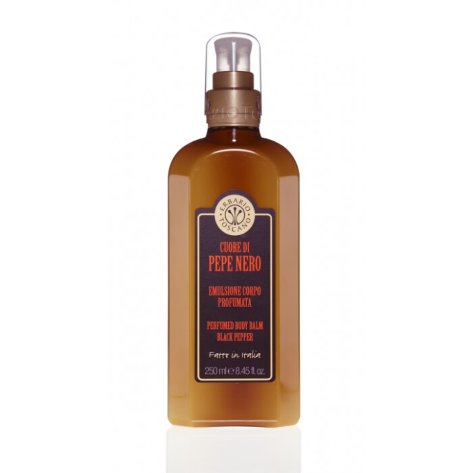 Parfémovaný tělový balzám (250 ml) od italské značky Erbario Toscano s vůní černého pepře, citrusů, jantaru, pikantních a dřevitých tónů pokožku po koupeli vyživí a příjemně provoní. Balzám obsahuje arganový olej, který je bohatý na nenasycené mastné kyseliny, vitamín E a zajišťuje hydrataci a pružnost pokožky. Bambucké máslo je bohaté na antioxydanty a vitamíny, má uklidňující účinky. Vyrobeno v Itálii.