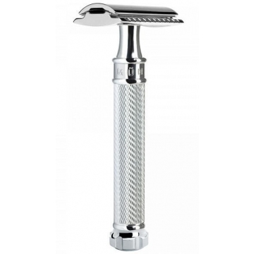 Tradiční holicí strojek od Mühle na klasické žiletky s otočným kolečkem na konci rukojeti pro odejmutí horního dílu hlavice. Spodní část hlavice zůstává připevněná k masivní rukojeti. Výměna žiletek je tak velmi jednoduchá. Strojek se vyznačuje přesnou ergonomií a krásným designem. Je celokovový a pochromovaný. Rukojeť je velmi jemně zdobená. Dodáváno v dárkové krabičce s jednou žiletkou Derby. Vhodný pro každodenní holení. Délka strojku je 107 mm, průměr rukojeti je 14 mm a váha je 90 g. Vyrobeno v Německu.