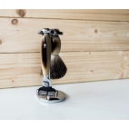 Krásná třídílná sada na holení řady Vivo od Mühle. Řada Vivo se vyznačuje baňatým tvarem rukojetí. Model Horn Brown má rukojeť vyrobenou z kvalitní pryskyřice v imitaci hnědého rohu. Kovové části jsou vyrobeny z mosazi a jsou pochromované nebo poniklované. Štětka je vyrobena z čistých jezevčích štětin. Je určena pro všechny, kteří mají při přípravě na holení rádi masážní efekt. Vyrobeno v Německu.
