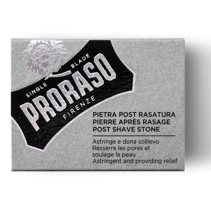 Přírodní kamenec Proraso ( 100 g) určený pro zastavování krvácení při poranění u holení. Po navlhčení má kamenec antiseptické účinky, zastavuje krvácení a uzavírá póry.